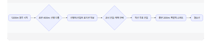 A["1200m 경주 시작"] --> B{"초반 400m: 선행 다툼"};